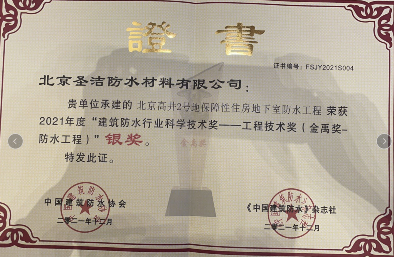 • 中國建筑防水工程“金禹獎”銀獎