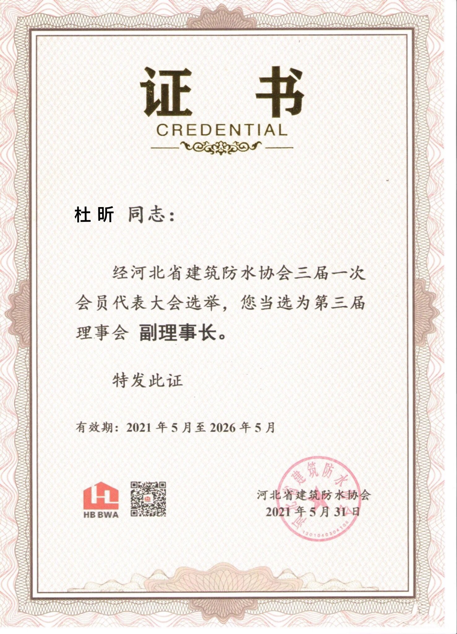 • 杜昕河北防水協會副理事長證書