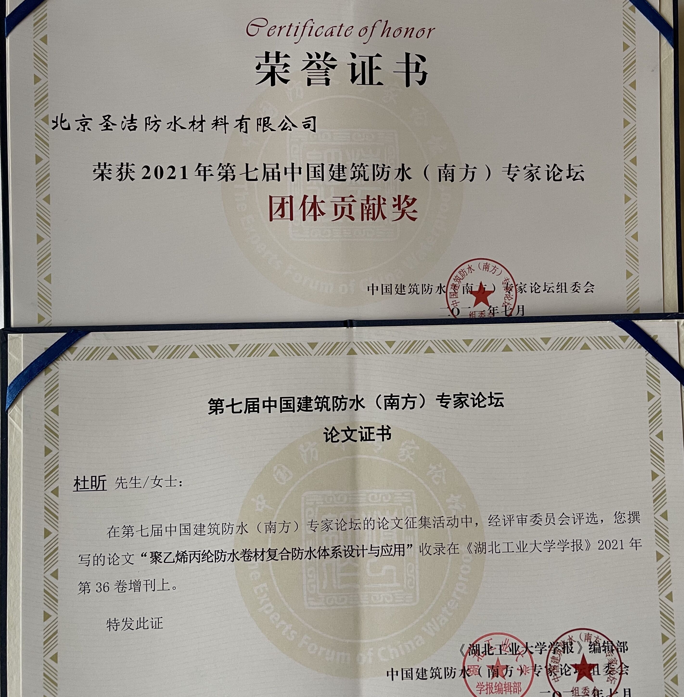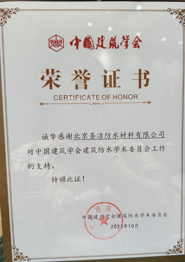 • 中國建筑學會建筑防水學術委員會榮譽證書