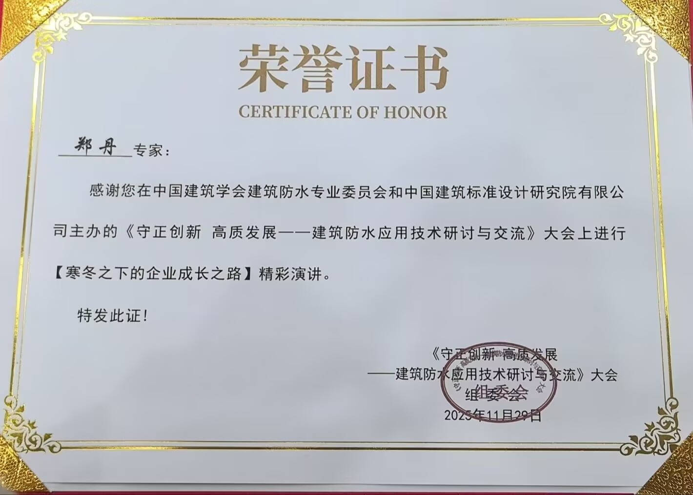 • 鄭丹全國防水創新技術交流大會優秀演講專家